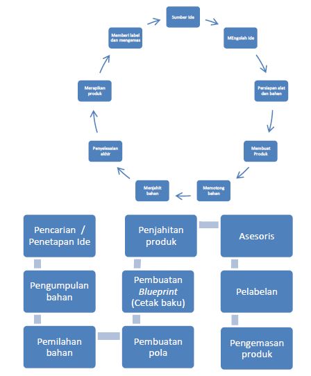 1. Diagram di bawah ini adalah alur proses produksi pembuatan kerajinan tekstil. Pada sistem produksi kerajinan tekstil terdapat beberapa tahapan yang berbeda antara satu perisahaan dengan perusahaan yanglain, hal ini dapat terjadi karena setiap perusahaan memiliki kekhasan tersendiri.